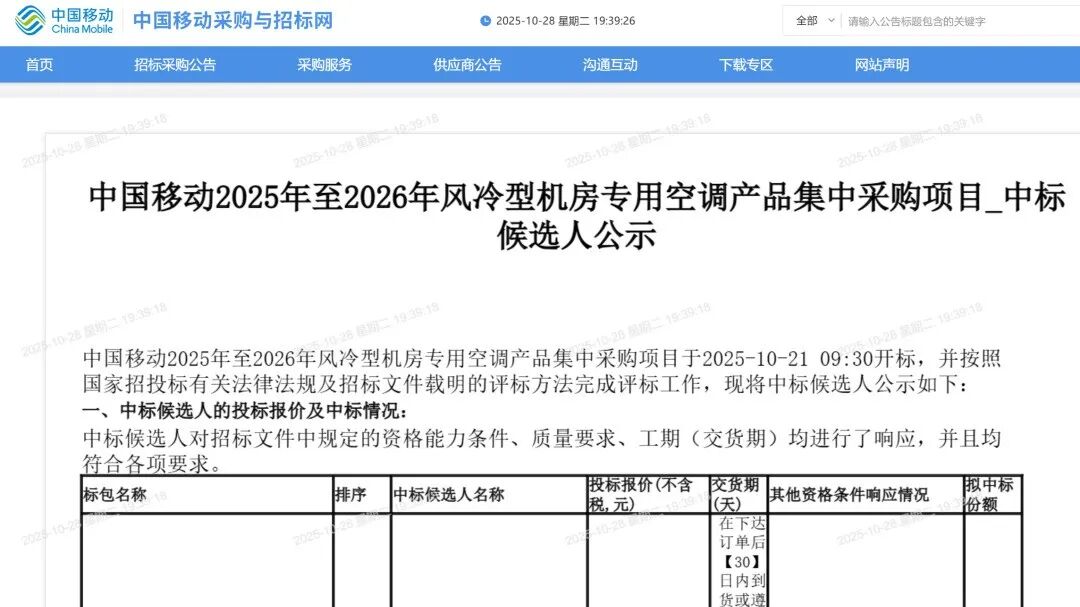 近日,中国移动2025-2026年风冷型机房专用空调集中采购项目中标结果正式公示,七家企业成功中标这场总规模达2791台的采购超大单(合计为11.13亿)。
